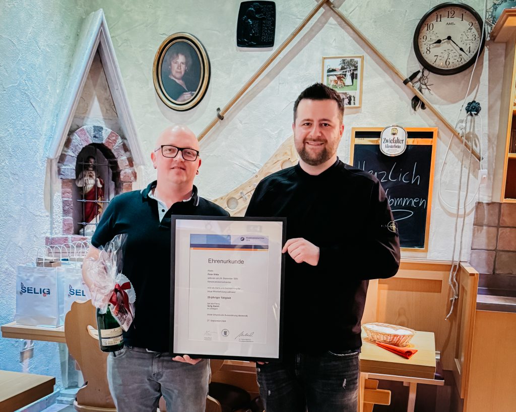 Wir durften bei unserer Weihnachtsfeier 2024 unseren Mitarbeiter Peter zu 20 Jahren Tätigkeit bei der SELIG GmbH beglückwünschen.